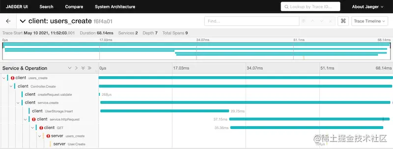 前三个是一个成功的请求,后两个是失败的追踪信息。
