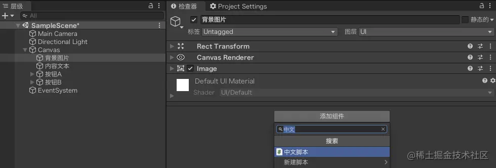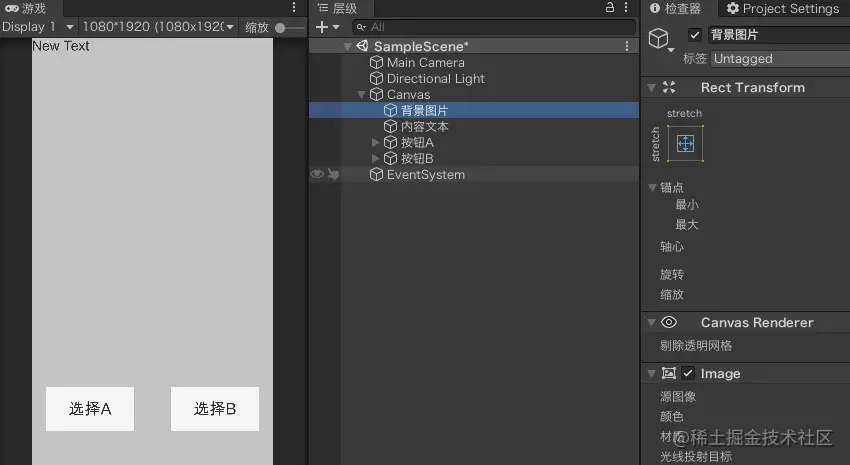 设置好后将新建的UI组件全部重命名,分别为:“背景图片”,“内容文本”,“按钮A”,“按钮B”
