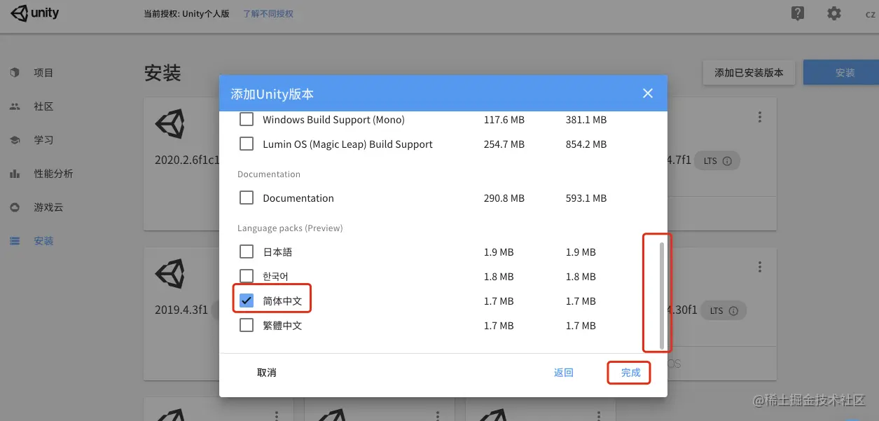 打开Unity Hub,选择安装任意版本,将右侧滑动条拉到底部,勾选 ☑️ 简体中文,然后点击完成,等待安装即可: