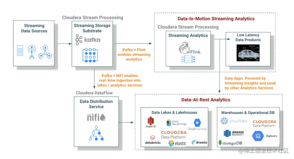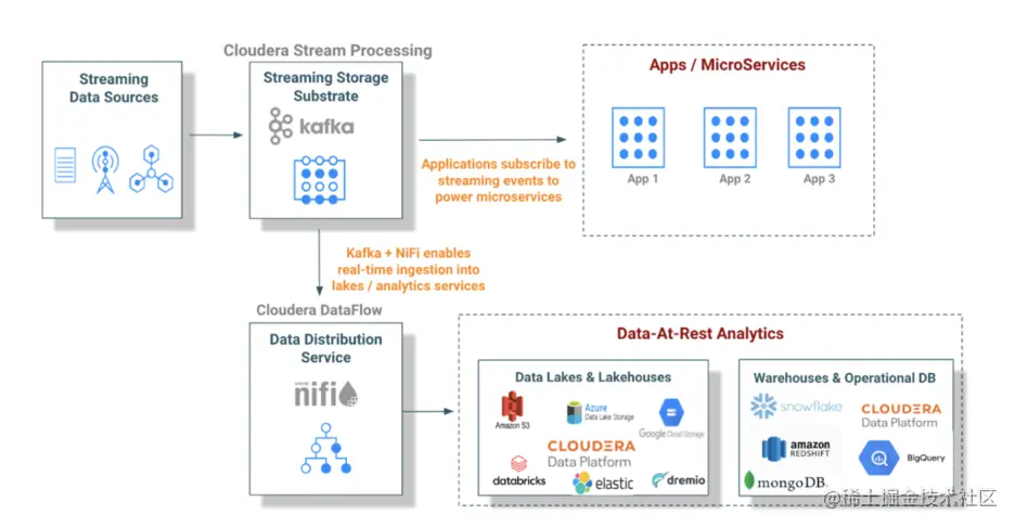 - 应用程序集成和微服务:实时集成用例要求应用程序能够订阅这些流并与下游系统实时集成。 这些期望的结果引发了对分布式流存储基板的需求,该基板针对实时摄取和处理流数据进行了优化。Apache Kafka 专为满足这一需求而构建,Cloudera 是最早提供支持的供应商之一。分别由 Apache Kafka 和 NiFi 提供支持的 Cloudera 流处理和 DataFlow 的结合帮助数百名客户构建了实时摄取管道,并通过如下架构实现了上述预期结果。