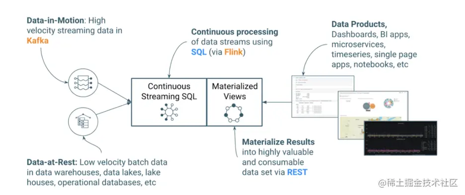 图 6:流式和批处理的融合:使用 SQL Stream Builder (SSB),用户可以轻松地为流式和批处理数据源创建虚拟表,然后使用 SQL 声明过滤、聚合、路由和变异数据流的表达式。 我们用户的另一个常见需求是简化将流分析管道的结果提供给他们正在创建的数据产品的过程。这些数据产品可以是 Web 应用程序、仪表板、警报系统,甚至是数据科学笔记本。 SSB 可以将流式 SQL 查询的结果具体化为可通过 REST API 读取的数据的持久视图。这种高度消耗的数据集称为物化视图 (MV),BI 工具和应用程序可以使用 MV REST 端点来查询数据流,而不依赖于其他系统。Kafka 作为存储流式传输基板,Flink 作为核心流式处理引擎,SQL 可以更快地构建数据应用程序,以及 MV 来使流式传输结果普遍可用,从而实现了下面描述的混合流式数据管道。
