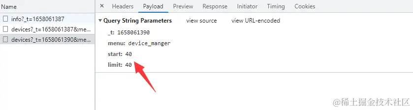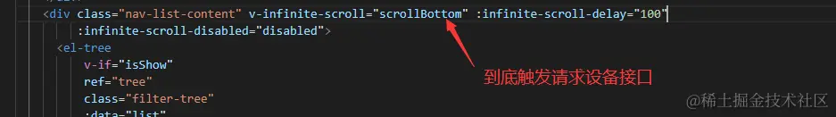 2)请求设备接口使用的是element-ui提供的方法,当侧边栏滚动条到底就会触发设备接口,如图: