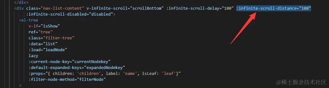 4)解决兼容性问题即可。在项目代码中调整infinite-scroll-distance,在默认值里提高兼容性,如图: