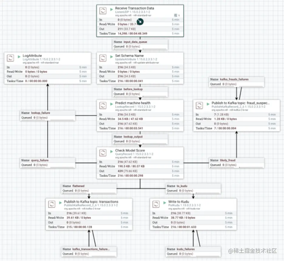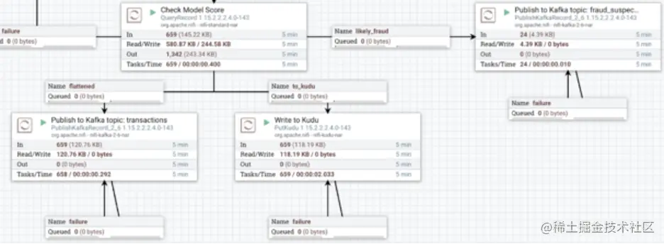 - 如果欺诈分数高于某个阈值,NiFi 会立即将事务路由到通知系统订阅的 Kafka 主题,该主题将触发适当的操作。