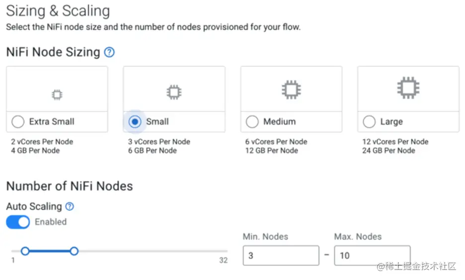 在流程部署中,您可以定义流程执行的参数,还可以选择流程的大小和自动缩放特性:
