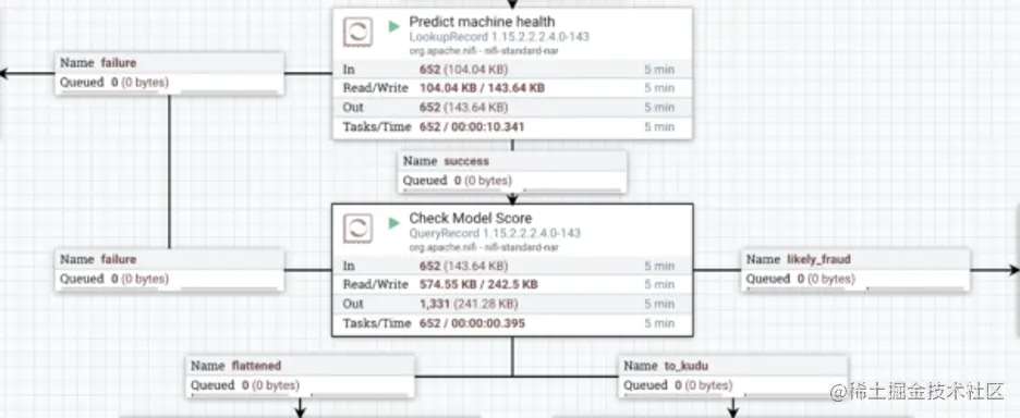 LookupRecord 处理器的输出,其中包含与 ML 模型的响应合并的原始交易数据,然后连接到 NiFi 中一个非常有用的处理器:QueryRecord 处理器。