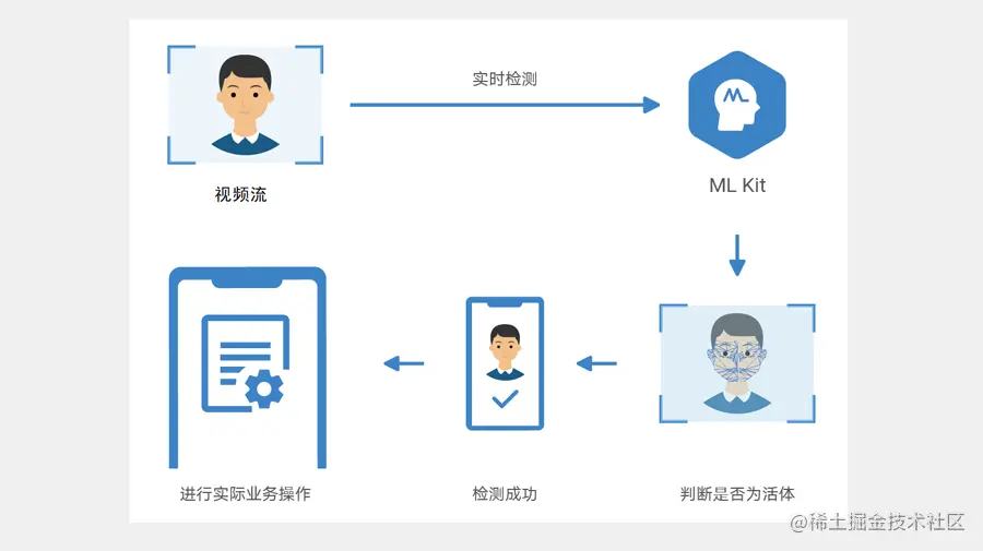 华为机器学习服务的动作活体检测能力,通过采用指令动作配合的方式进行活体检测,在眨眼、张嘴、左摇头、右摇头、注视、点头六种动作中随机选择三种,让用户按指令完成动作,使用人脸关键点及人脸追踪技术,通过连续的图片,计算变化距离与不变距离的比值,进行上一帧图像与下一帧图像的对比,从而验证用户是否为真实活体本人操作,对照片、视频和面具的攻击具有很好的防御效果,是人脸识别能否有效应用的前提条件。