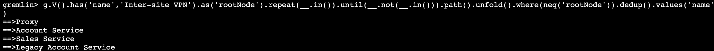 where(neq('rootNode'))意味着我们的输出中不包括我们的根节点dedup()删除任何重复的节点(即我们可能两次遍历同一个节点,我们不希望在列表中出现这种情况)- 最后,我们输出找到的服务的名称