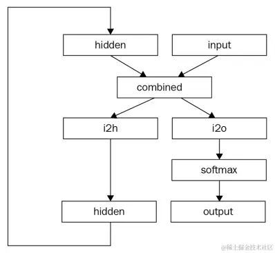 forward函数将input向量和hidden向量组合在一起,并将其传入两个线性层,从而生成输出向量和隐藏状态。对于output层,我们应用log_softmax函数。