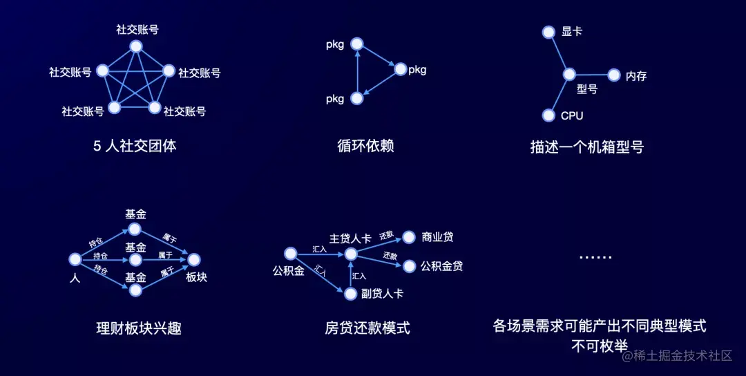 不同场景、需求,可能产生不一样的关键图模式。模式中的节点和边也可以配置业务语义的属性条件。所以我们说图模式是不可枚举的。在分析图模式时,一般建议用户结合领域专家经验,边探索边沉淀的方式去绘制一个自己场景所需的模式。再在数据上进行模式匹配计算,找到关心部分,即子结构、子图。