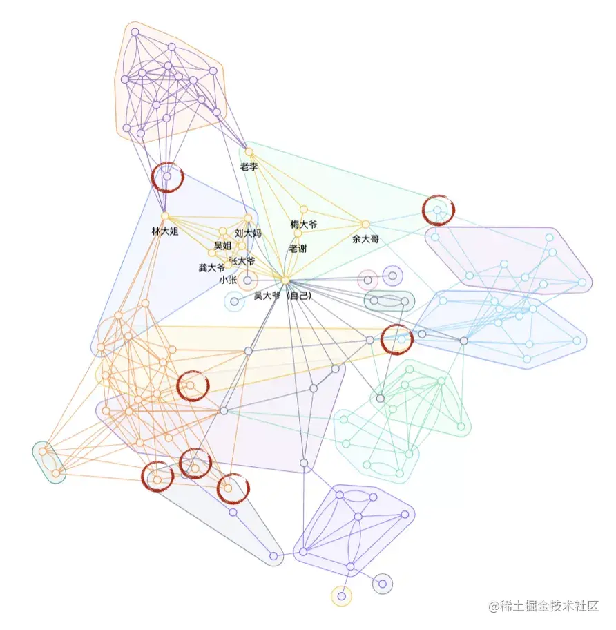 图结构还有什么分析方式呢?社区分析可用于分析吴大爷的人际关系网络情况。下图数据结合了吴大爷他所在的社团以及他线上的社交媒体的各个人员,进行人际网络扩张得到的更大的交际网络。节点和边的颜色映射了不同人员扩展出的数据,即节点和边颜色代表来数据的来源渠道。