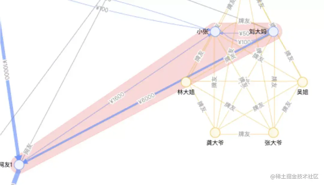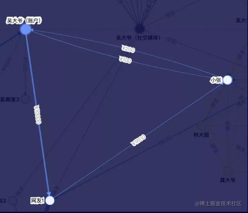 图的关系结构,使它区别于统计型数据,这也是图更复杂的一大原因。而复杂的关系结构,也能带给我们更多的信息。现在,我们来看如何分析图的结构。已知吴大爷先给小张转账了 100 元;小张回报 200 元;然后吴大爷给王友1转账 1 万元。这几条边我们可以很快地在图上找到,同时也很容易发现这个链路存在闭环,即网友1给小张转账 1600 元。