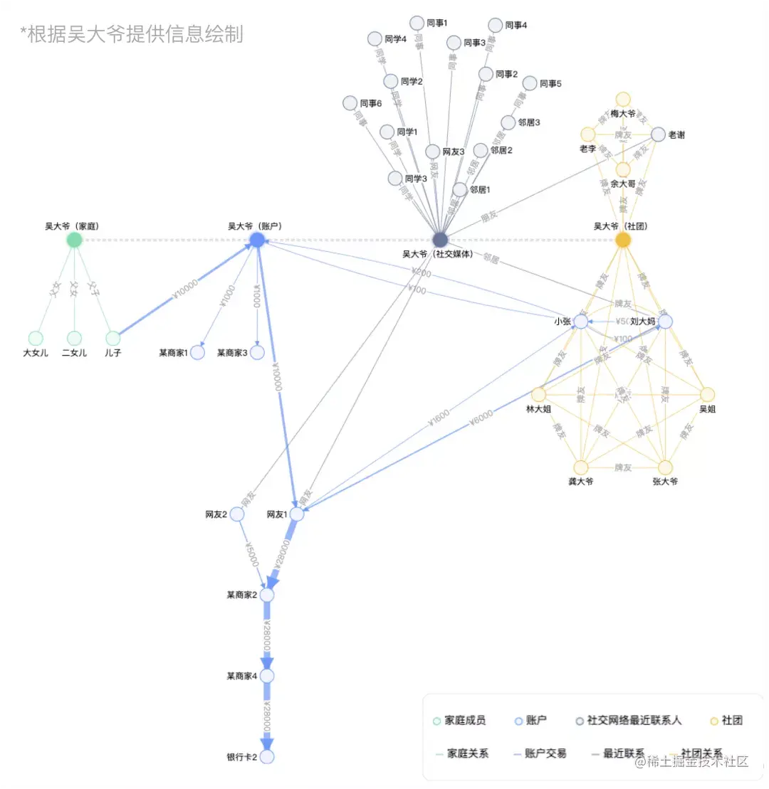来看这样一个虚构的电信诈骗小故事:65 岁的吴大爷被骗了。根据他所提供的相关信息以及有关部门的调查结果,我们得到了与他相关的几个方面的关系数据,包括他的家庭主要成员、账户最近转账记录、社交媒体最近联络人、以及他所参与的两个老年活动社团。使用这份数据,我们希望通过图可视分析的手段发现风险、保护潜在受害人。