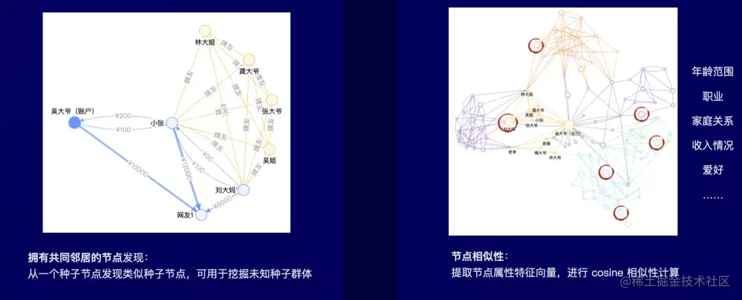 有了若干个种子节点之后,一般需要对它们进行扩散,即寻找更多相似的种子节点。左图展示了“拥有共同邻居的节点发现”方法,找到与吴大爷拥有共同邻居小张的其他人。这些人可能也有被骗的风险,他们也许正在被骗,也有可能将要被骗。根据这一信息,我们可以进行定点定向的提示和宣传。