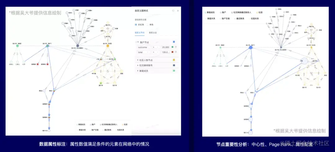 下图中左边是数据属性的标注,吴大爷所在的小城市里,老年人每月一般不会有太大的收入和支出。我们就把所有的账户节点中,月支出金额大于 2 万的标注为绿色,把月收支总额大于 10 万元的标记为红色。 我们看到被标记为红色的节点是商家节点,符合我们的预期。但有一些个人节点,比如说吴大爷、小张、刘大妈、郭大爷,他们的支出金额比较高,这些节点很可能需要我们继续关注。他们也许正在被骗,或者是有其他潜在的风险。