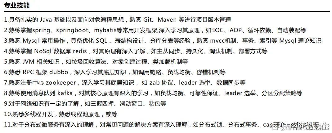 大家会发现,其实面试官 **「基本都是按照你写的技能」**去问的,基本要求就是你简历上写的东西,你都需要熟悉,基本技能栏一定要 「体现某些技术的深度」,能让面试官看出来你平常会有自己去深度学习