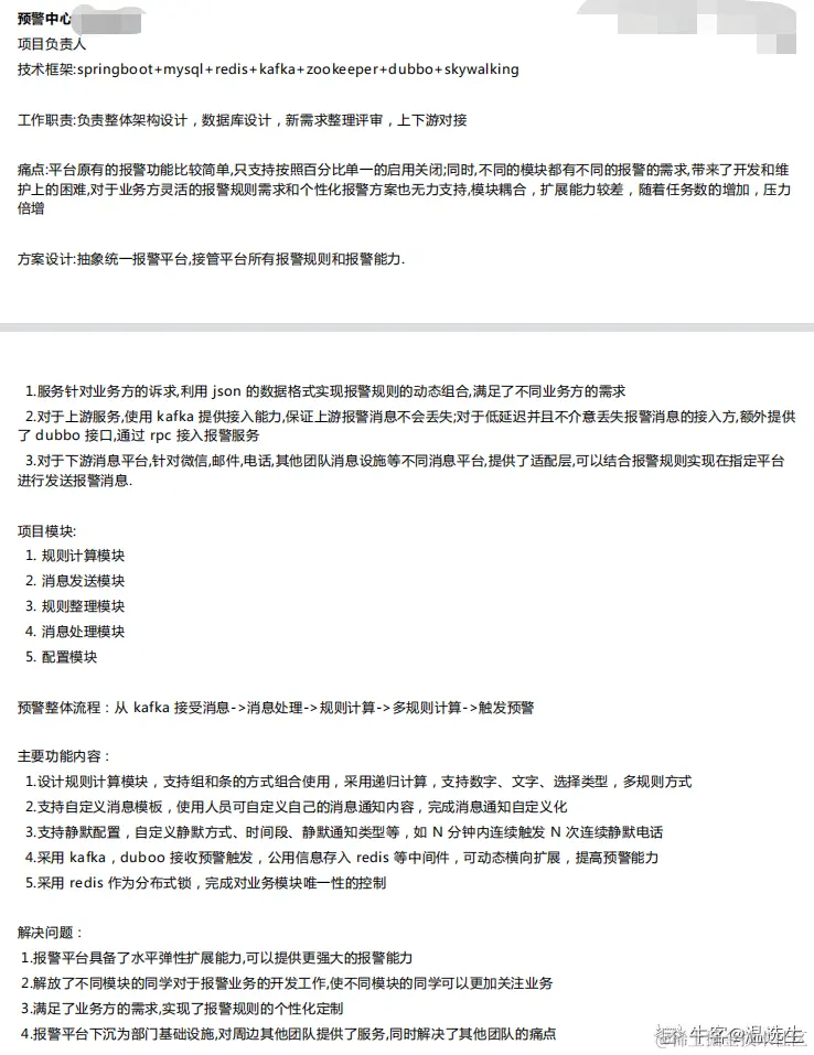 给大家看下专业技能栏,我在这里写的基本都是我记得很熟的,不熟悉的框架我一般不会写上去,比如 rabbitmq 虽然自己有看过,但是不是很熟,对于不熟的我是写在后面项目架构中,当然这里就可能会设计到架构选型的问题