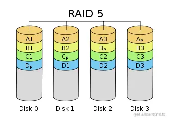 将数据和相对应的奇偶校验信息分别存储在不同的硬盘上,奇偶校验信息占一个硬盘的空间,允许损坏一个硬盘。当一个硬盘损坏时,可以根据剩余的数据和相对应的奇偶校验信息计算出损坏的数据,恢复数据时性能会受到较大的影响。RAID 5写性能偏低,尤其是随机写性能,建议在读写不太频繁的场景上使用,如:用作数据备份。