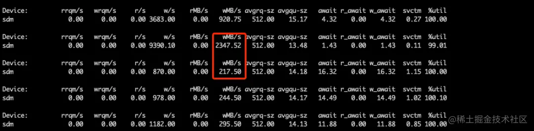 可以看到,当上层有大量数据下发时,缓存很快就被击穿,写性能呈现断崖式下划