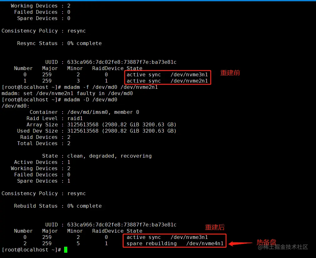 VROC拥有热备功能,当检测到设备故障时,热备盘可用于重建RAID