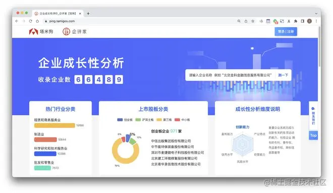 “企评家”企业成长性评价系统(简称:企评家系统)是采集企业公开数据与行业信息,利用人工智能算法模型,对企业创新能力、信息水平、风险水平、盈利能力等方面进行多维度评价,并在行业中进行评价排序,以实现对企业成长性的综合反映。该系统集数据采集、人工智能评价模型和数据可视化输出平台为一体,为投资人、金融机构、产业管理部门以及企业提供投资决策判断、风险前置预警中、过程动态监控跟踪以及企业自测等服务。