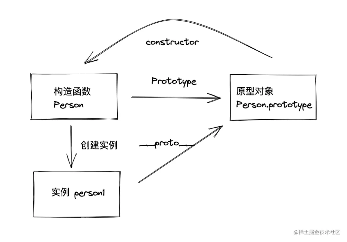 当这个函数作为构造函数去创建实例的话,那么这个实例的原型就会指向这个对象,也就是指向这个 Person.prototype。你也可以将 Person.prototype 理解指向了一个共享的对象。