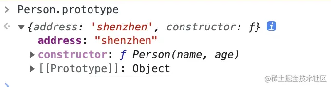 打印 Person.prototype我们可以看到,除了添加上去的 address 属性之外,还有一个constructor属性