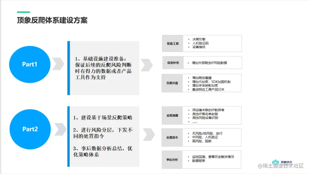 其次,在策略层面,需要建设基于场景的反爬策略,比如同设备关联的IP数异常、爬虫IP黑名单封禁、爬虫风险设备识别等等。在处置层,需要进行风险分层,并下发不同的处置指令,比如系统判定为无风险/低风险时,则放行;系统判定为中风险是,则需进行人机验证;系统判断为高风险时,则立即阻断。