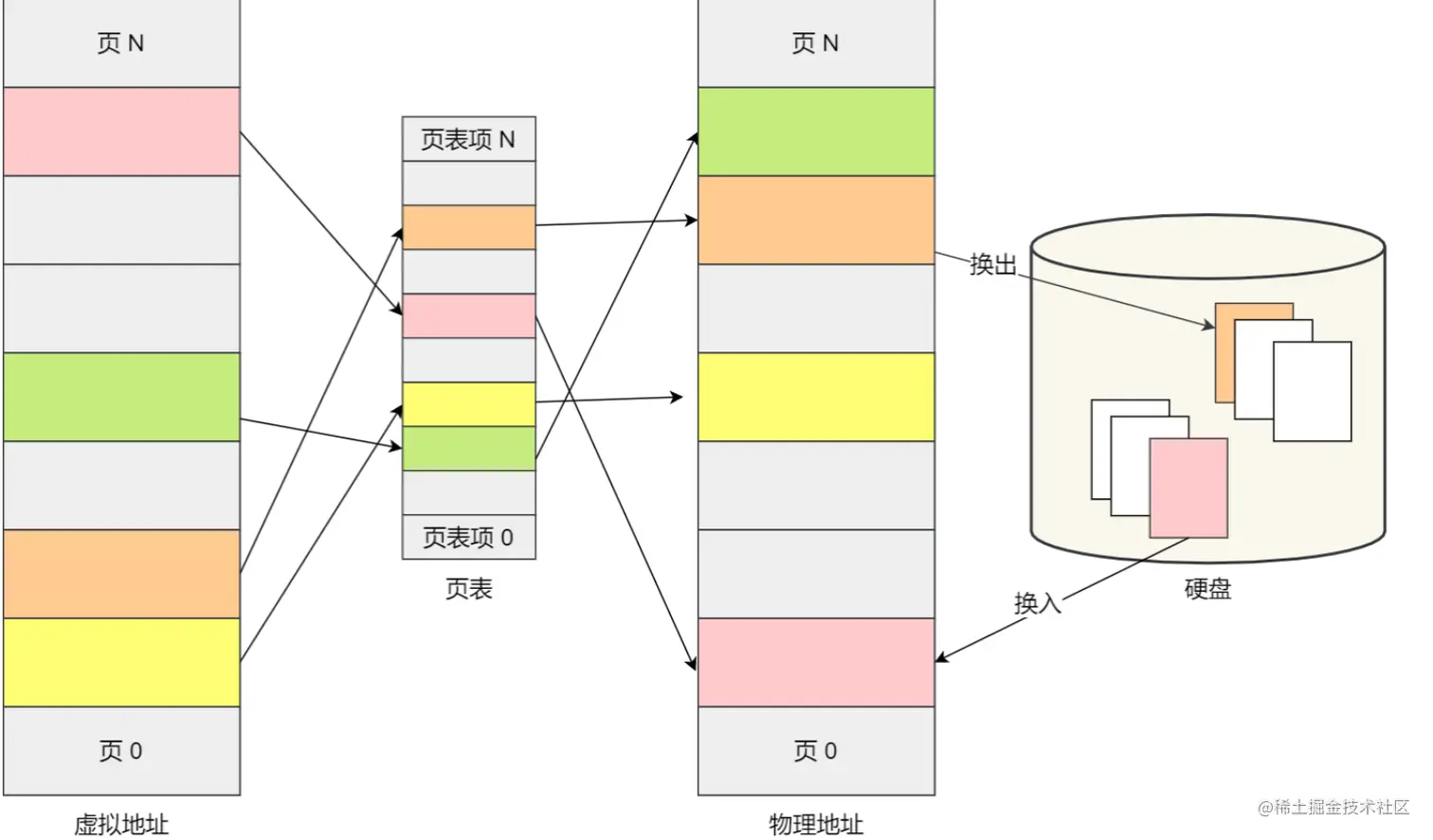 一旦需要的时候,再加载进来,称为换入(Swap In)。所以,一次性写入磁盘的也只有少数的一个页或者几个页(不会出现一整个段的磁盘读写),不会花太多时间,内存交换的效率就相对比较高。