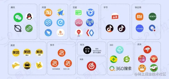 目前大型互联网巨头几乎都有投入到小程序生态的建设中,包括美团、快手、网易、华为、腾讯、阿里、百度、字节、快应用、360和京东这十系平台。