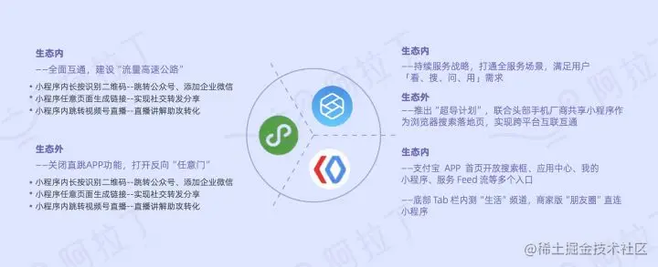 但其实每个平台小程序因为用户的不同需求也有不同的侧重点,如果将目前体量较大的小程序进行对比的话,其实也能发现一些很不一样的特别之处,各大平台都是根据自身定位去定义小程序的。