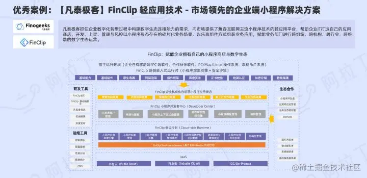 其实市场中也有非常成熟的解决方案可以直接便捷的使用,在《2021 年度小程序互联网发展白皮书》就看到凡泰极客推出了FinClip去填补市场的空白, 介绍中讲到正是基于企业数字化转型过程中构建数字生态连接能力的需求,向市场提供了兼容互联网主流小程序技术的轻应用平台,帮助企业打造自己的应用商店,开发、上架、管理与风控以小程序形态存在的碎片化业务场景,以乐高组件方式组装业务应用,赋能业务部门进行跨组织、跨机构、跨行业、跨终 端的数字生态运营。