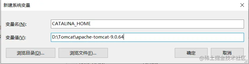 获取压缩包在D盘解压一下,然后环境配置。新建系统变量名:CATALINA_HOME,变量值:D:\Tomcat\apache-tomcat-9.0.64