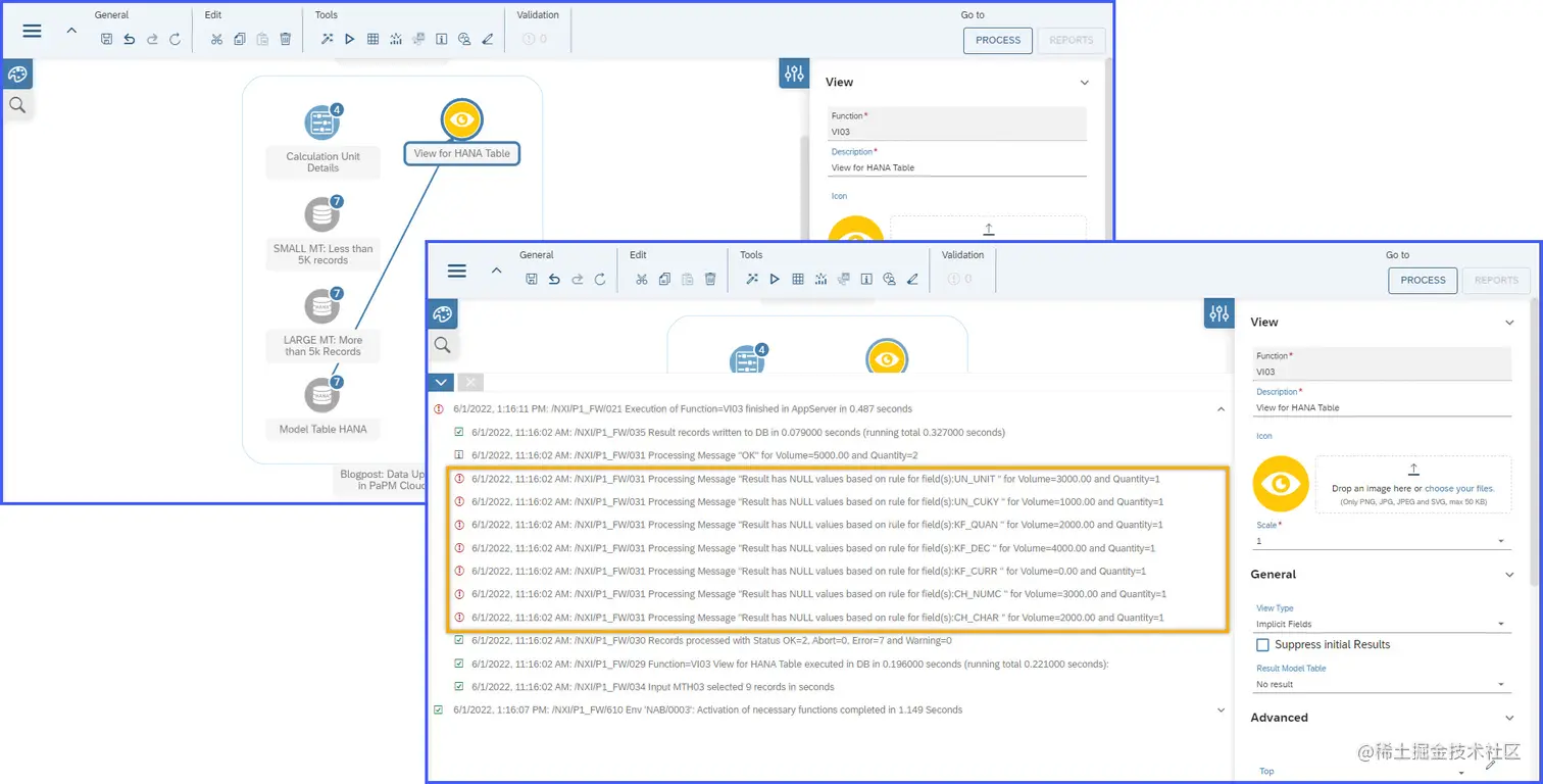 然而,当试图 使用 例如视图函数从Model Table HANA 投射或进一步 丰富数据 时 。视图函数的执行会返回一个错误。 由于模型中存在 NULL值,处理消息,并相应地显示在消息日志中。