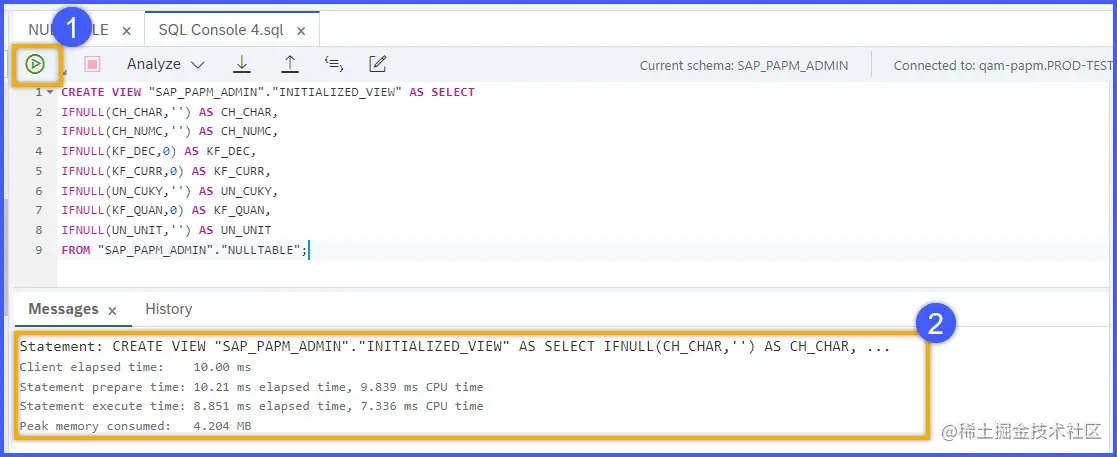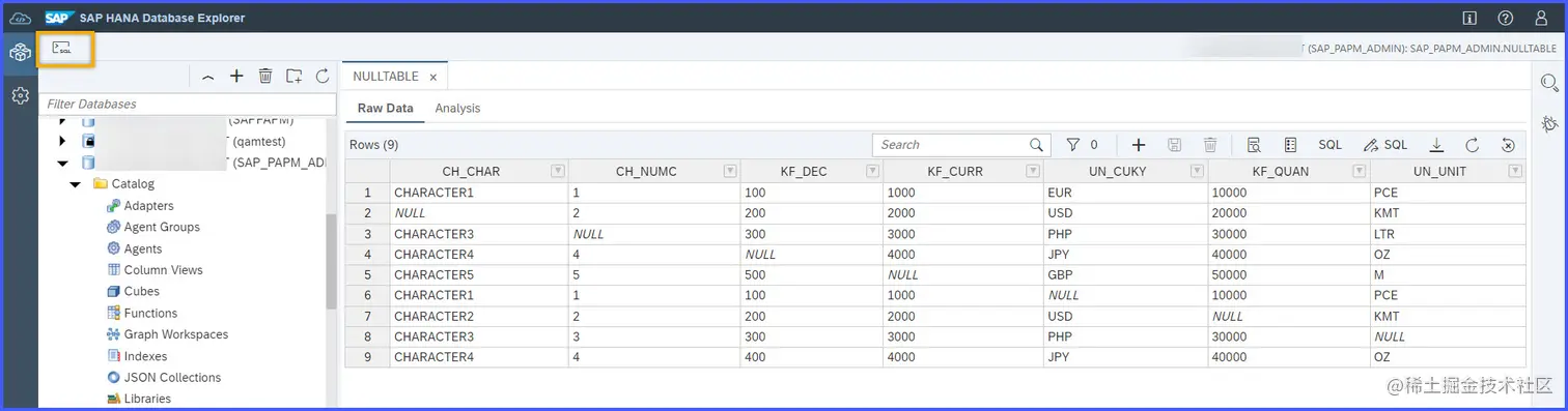 会出现SQL控制台。由于SAP HANA表的字段都有NULL值,而我们的目标是初始化表中的所有NULL值。