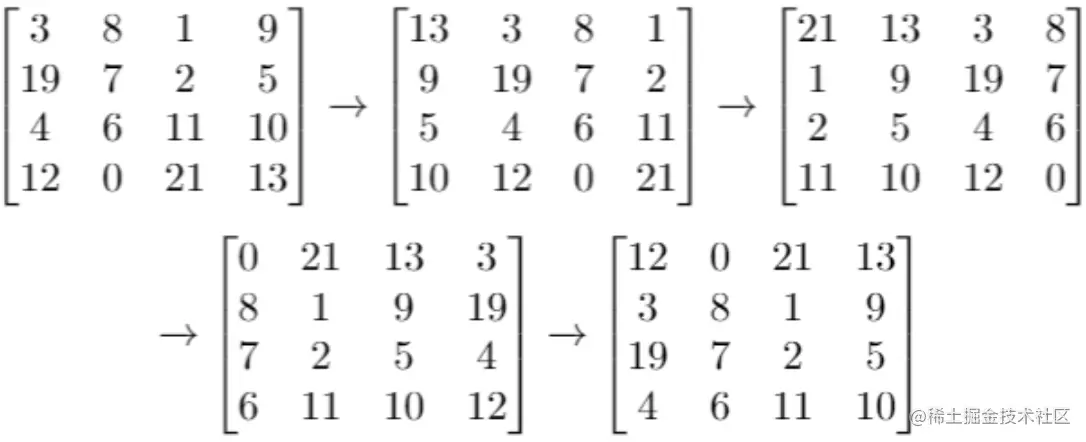 其实在转换过程中,其实存在一定的规律的。为了清楚看到其中的规律,我们可以将二维数组转换为一维数组。那么对比转换前后的两个一维数组,我们可以非常清晰的看到其中的规律,也就是,在每次迁移过程中,数组中每个元素都会向后移动1位。如果一共要移动6次的话(即:k=6),那么一维数组中每个元素都会向后移动6位,当然,对于越界的元素,都会再次插入到数组的头部。根据如下规律,我们可以找出从旧二维数组转换为新一维数组的规律公式,这样k就会作为转换公式的参数,一次性的就可以获得最终转换后的二维数组。具体逻辑如下所示: