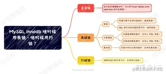 MySQL 啥时候用表锁,啥时候用行锁? MySQL Innodb 的锁可以说是执行引擎的并发基础了,有了锁才能保证数据的一致性。众所周知,我们都知道 Innodb 有全局锁、表级锁、行级锁三种,但你知道什么时候会用表锁,什么时候会用行锁吗? 虽然对 MySQL 的知识点挺熟悉的,但一开始看到这个问题,树哥也是有点懵,我还真没从这个角度去思考过。大家可以暂时 1 分钟思考下答案,后面我将带大家弄清楚这个问题。 对于这个问题,我只能粗略地想起一些片段,例如: