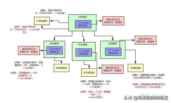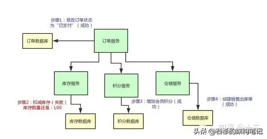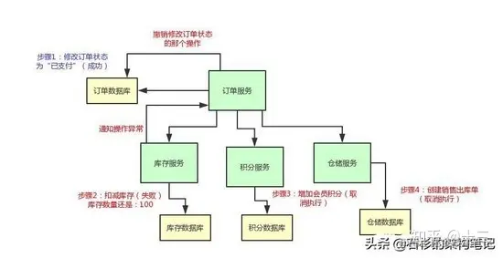 比如说库存服务要是扣减库存失败了,那么订单服务就得撤销那个修改订单状态的操作,然后得停止执行增加积分和通知出库两个操作。