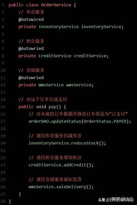 什么意思呢?也就是说,订单服务-修改订单状态,库存服务-扣减库存,积分服务-增加积分,仓储服务-创建销售出库单。