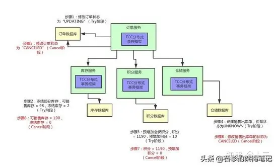然后这个时候,订单服务的TCC分布式事务框架只要感知到了任何一个服务的Try逻辑失败了,就会跟各个服务内的TCC分布式事务框架进行通信,然后调用各个服务的Cancel逻辑。