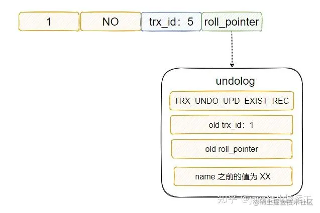 拿上面的insert (1,XX)这条语句举例,成功插入之后数据页的记录上不仅存储 ID 1,name XX,还有 trx_id 和 roll_pointer 这两个隐藏字段: