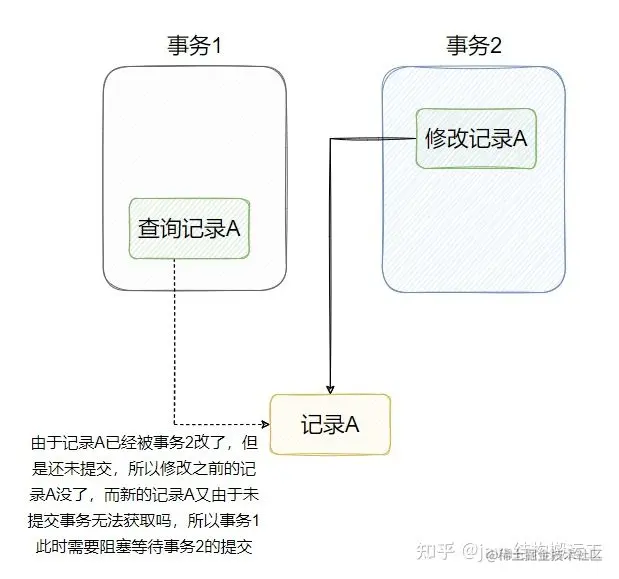 我:如果没有 MVCC 读写操作之间就会冲突。想象一下有一个事务 1 正在执行,此时一个事务 2 修改了记录 A,还未提交,此时事务 1 要读取记录 A,因为事务 2 还未提交,所以事务 1 无法读取最新的记录 A,不然就是发生脏读的情况,所以应该读记录 A 被事务 2 修改之前的数据,但是记录 A 已经被事务 2 改了呀,所以事务 1 咋办?只能用锁阻塞等待事务 2 的提交,这种实现叫 LBCC(Lock-Based Concurrent Control)。