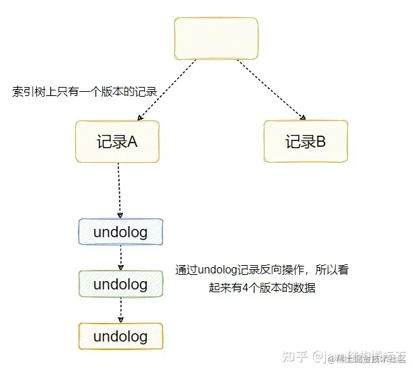 实际上 InnoDB 不会真的存储了多个版本的数据,只是借助 undolog 记录每次写操作的反向操作,所以索引上对应的记录只会有一个版本,即最新版本。只不过可以根据 undolog 中的记录反向操作得到数据的历史版本,所以看起来是多个版本。