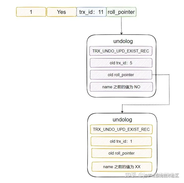 此时事务 5 提交,然后另一个 ID 为 11 的事务执行update Yes where id 1 这个语句,此时的记录和 undolog 就如下图所示:
