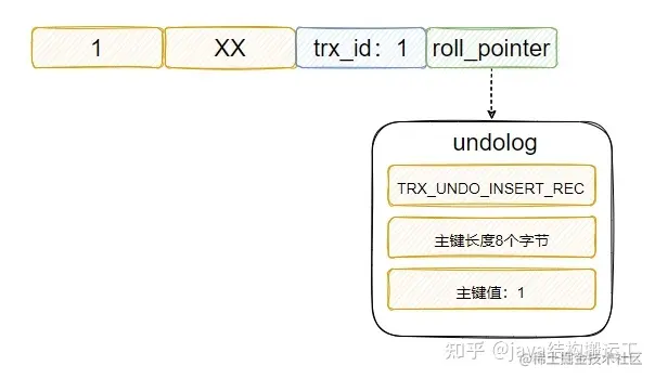 从图中可以得知此时插入的事务 ID 是 1,此时插入会生成一条 undolog ,并且记录上的 roll_pointer 会指向这条 undolog ,而这条 undolog是一个类型为TRX_UNDO_INSERT_REC的 log,代表是 insert 生成的,里面存储了主键的长度和值(还有其他值,不提)。