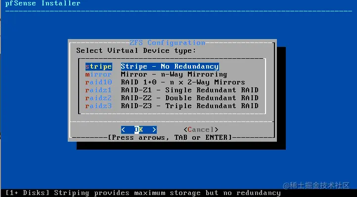 - Stripe: 在这种配置下,即使你添加了多个磁盘(RAID 0),Pfsense也会像单个磁盘一样工作。