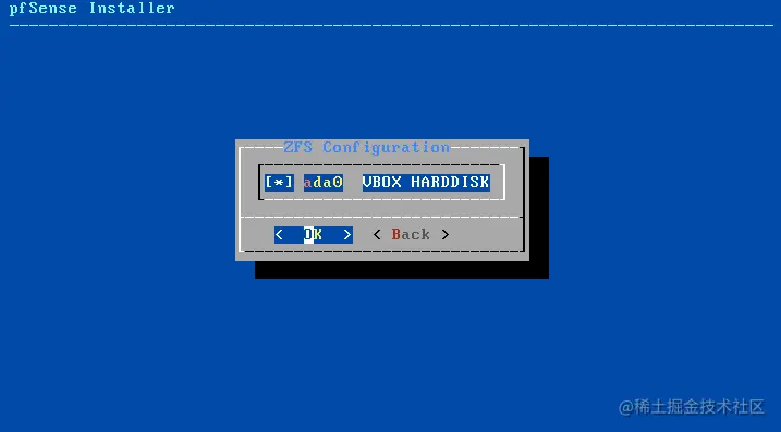 你需要选择将安装Pfsense的磁盘。在我的例子中,我使用Virtualbox来做这个教程。选择你想要的磁盘单元,然后按回车键。