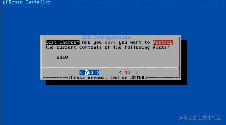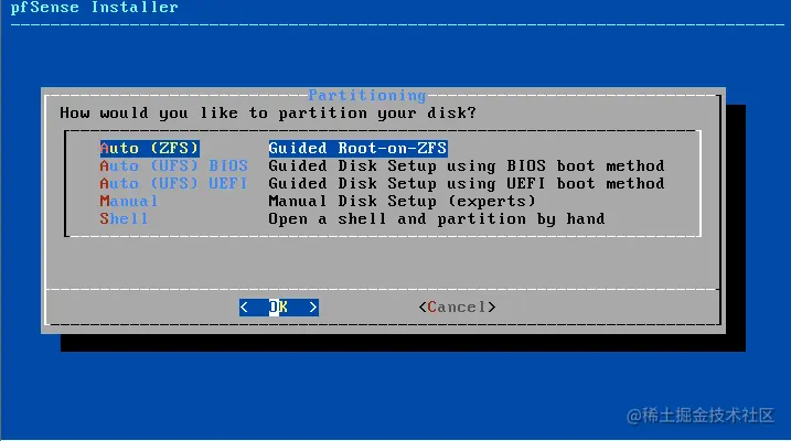 最近的Pfsense版本允许你选择ZFS作为文件系统。ZFS有很多功能,包括内联数据压缩、内联重复数据删除、ZFS发送/接收、RAID Z等等。在本教程中,我们将选择ZFS选项,但如果选择Auto UFS也能正确工作。选择你想要的选项,然后按ENTER键继续。