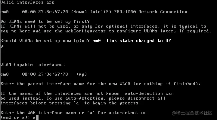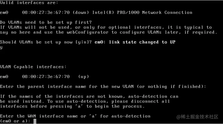 在第一次重启时,Pfsense会让你设置网络/接口。第一个接口是虚拟的。该虚拟网络接口是em0。你可以选择N,然后通过Web配置器进行配置,如下图所示。