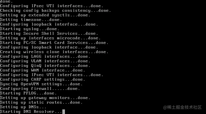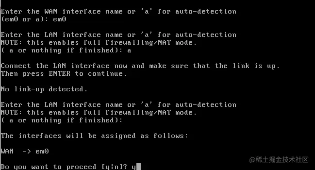 如果自动检测是正确的,按'y'来设置你的LAN接口。然后Pfsense将启动,如下图所示。